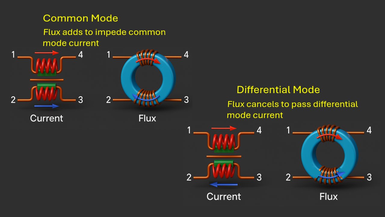 Common mode signals (noise present equally on both lines) induce magnetic flux in the same direction, which creates impedance and attenuates the noise.